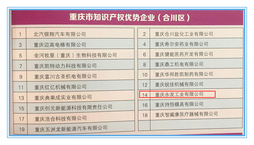 In December 2017, the company won the title of Chongqing Intellectual Property Advantage Enterprise.